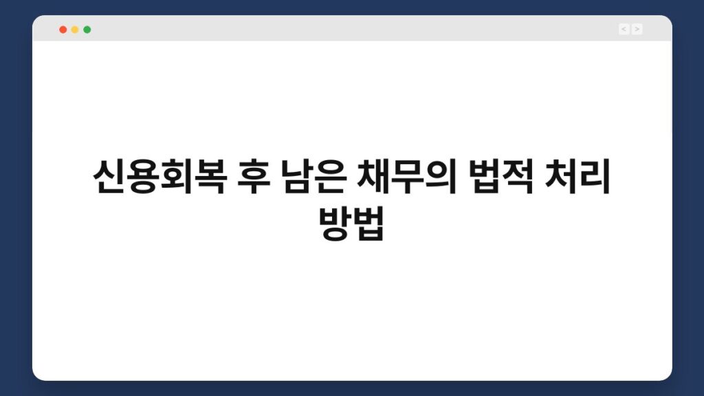 신용회복 후 남은 채무를 법적으로 처리하는 방법은 많은 이들에게 중요한 문제입니다. 신용회복제도를 통해 재정적인 어려움을 극복한 후에도 여전히 남아 있는 ...